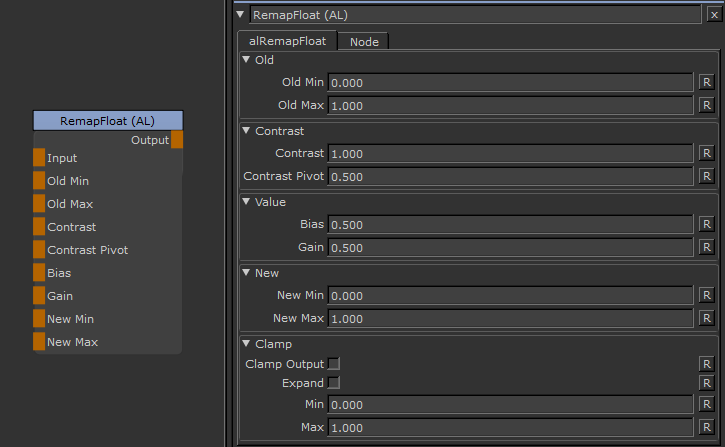 The alRemapFloat Node is a powerful Value Remapping Node, giving same results as alRemapFloat Node for Arnold (part of alShaders by Anders Langlands).