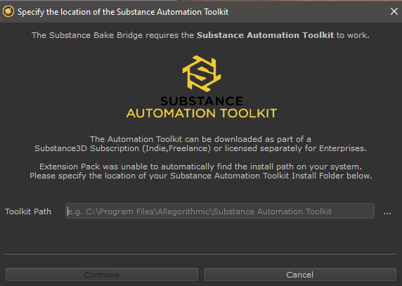 If the Substance Baker Bridge was unable to automatically detect your Substance Automation Toolkit Installation a dialog will prompt you
