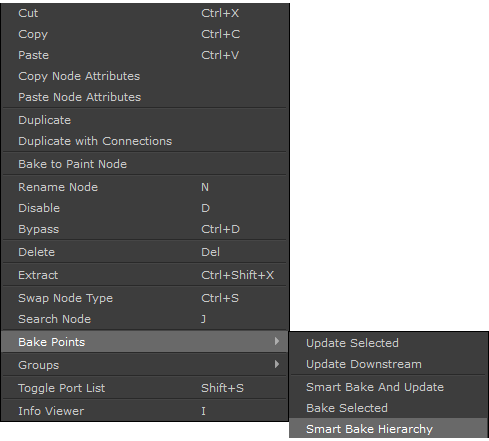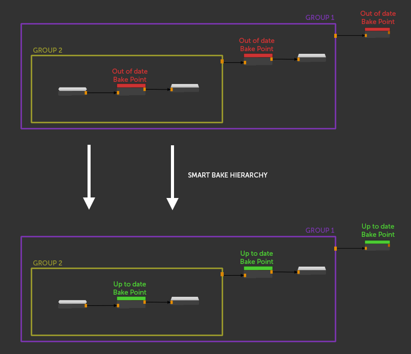 With the new 'Smart Bake Hierarchy' Option, all upstream Bake Points are automatically updated. Regardless if they exist in the current node graph or are part of a subgraph.