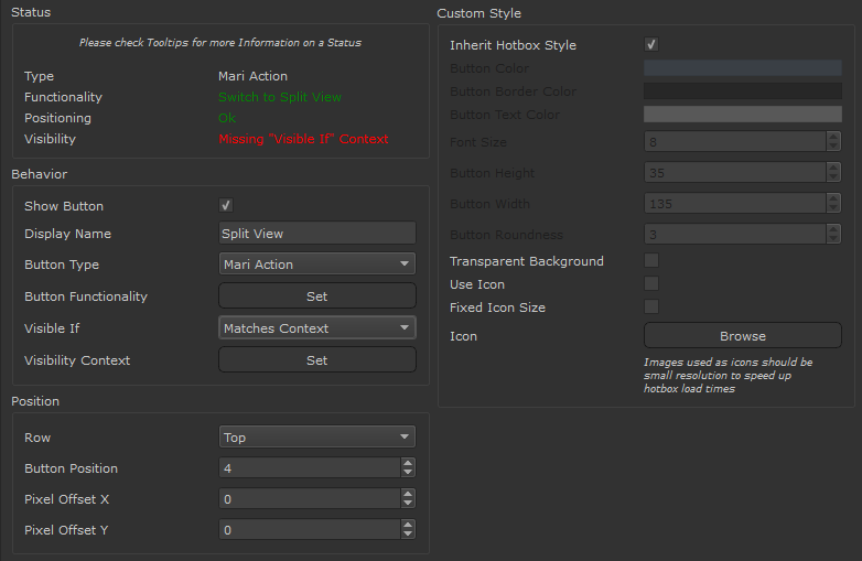 The Custom Style Group offers options to overwrite the style of a specific button so it is different than the style defined in the Hotbox Settings