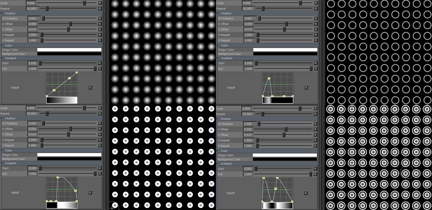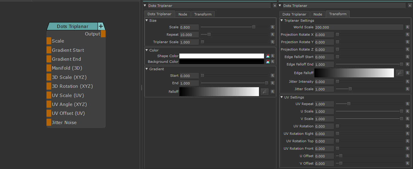 Dots Triplanar creates circular patterns. With the help of the included remapping you can create more complex patterns.