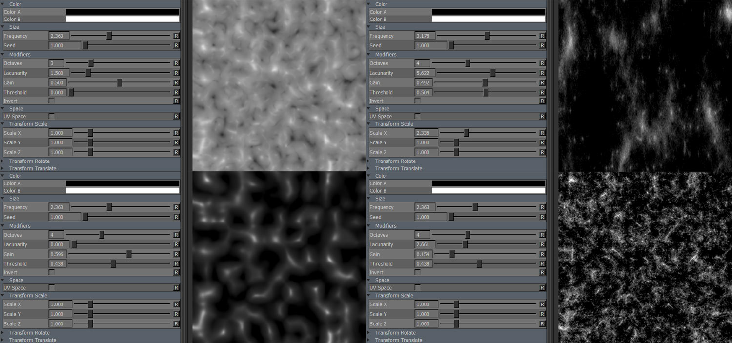 Will apply a scale along X,Y or Z to your noise. This is useful for creating patterns like woodgrain, drips etc.