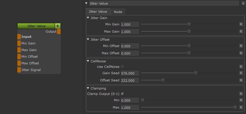 The Jitter Value Node allows you to gain and offset an input value randomly based on a supplied signal value