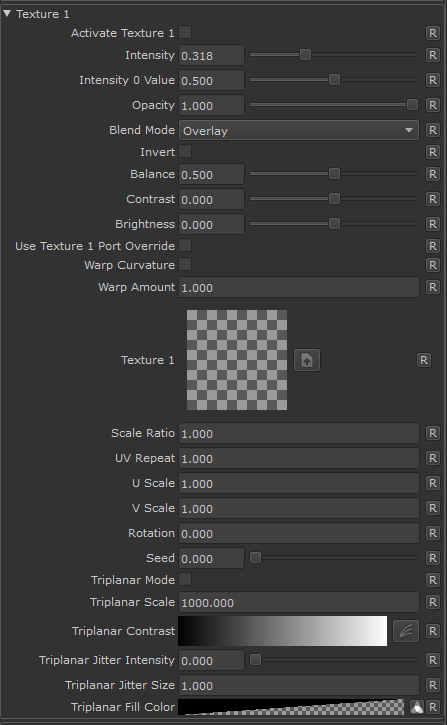 The Texture 1 Group allows you to overlay a texture over the result of the underlying groups either in Triplanar or Tiled Mode.