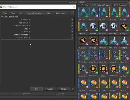 It is possible to hide or show Material Templates both in the Shelf and the Material Ingest Tool to reduce clutter and complexity