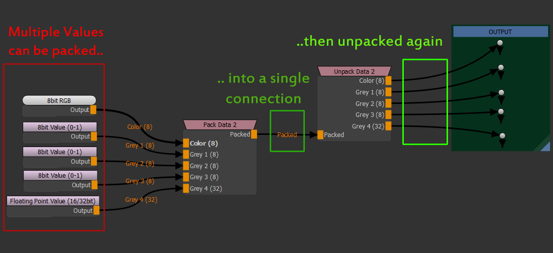 The Pack Data Node allows you to compress multiple values into a single output connection, then unpack them again