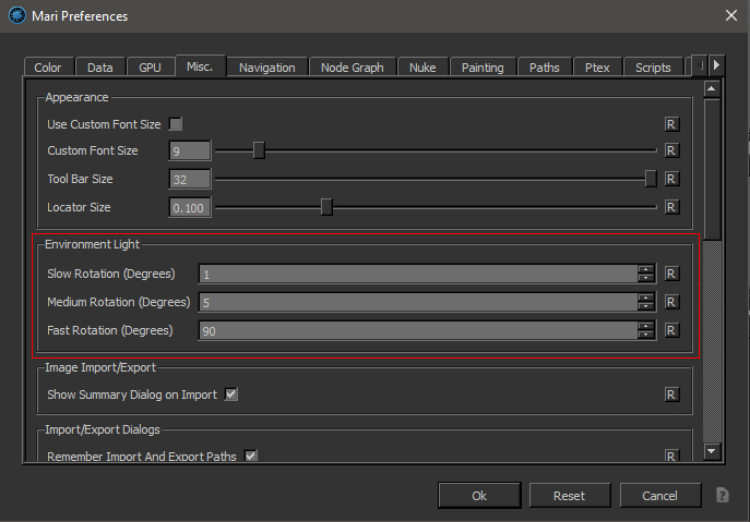 You can configure the rotation increments of the Light Rotation in the Mari Preferences / Misc Section: