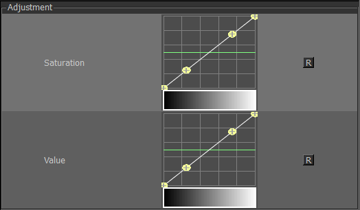 Adjusting the left halve of the curve will affect colors with saturation below 0.5, adjusting the right halve of the curve
