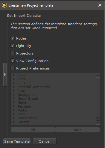 The Save Template Dialog is split into two sections (Template Creation & Import Defaults), which you can navigate inbetween by clicking the vertical splitter button