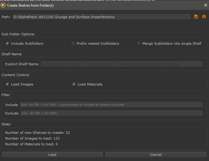 If checked, the contents of Subfolders of the supplied Path will be placed into a single Shelf with the Name of the Base Folder.