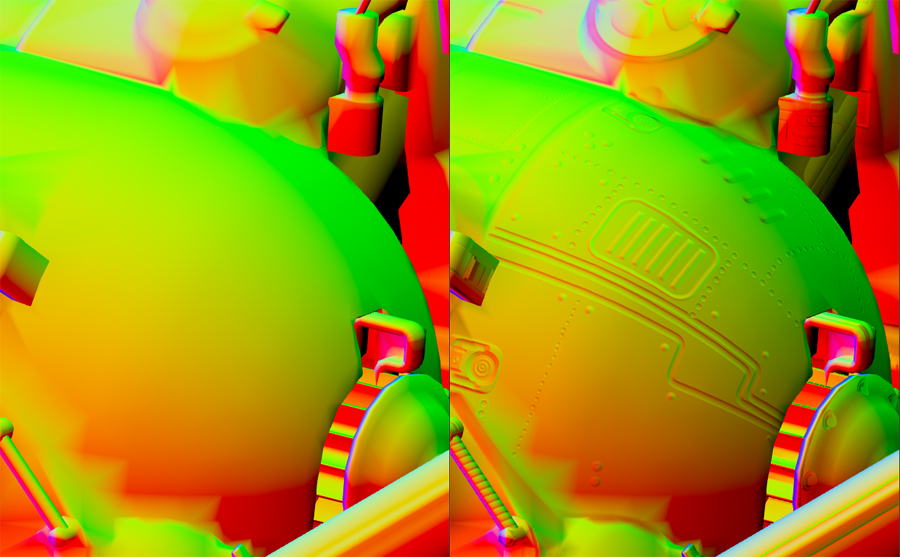 On the right the normals generated with the 'Tangent to Surface Normal' Adjustment over a Normal Map.