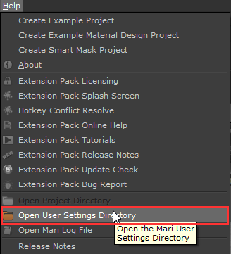 2.Or going via the Help Menu "Open User Settings Directory" and choosing the "Hotbox" Folder