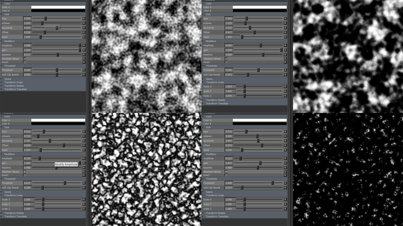 Amplitude affects the length and amount of fine detail the Lacunarity is contributing to the base pattern