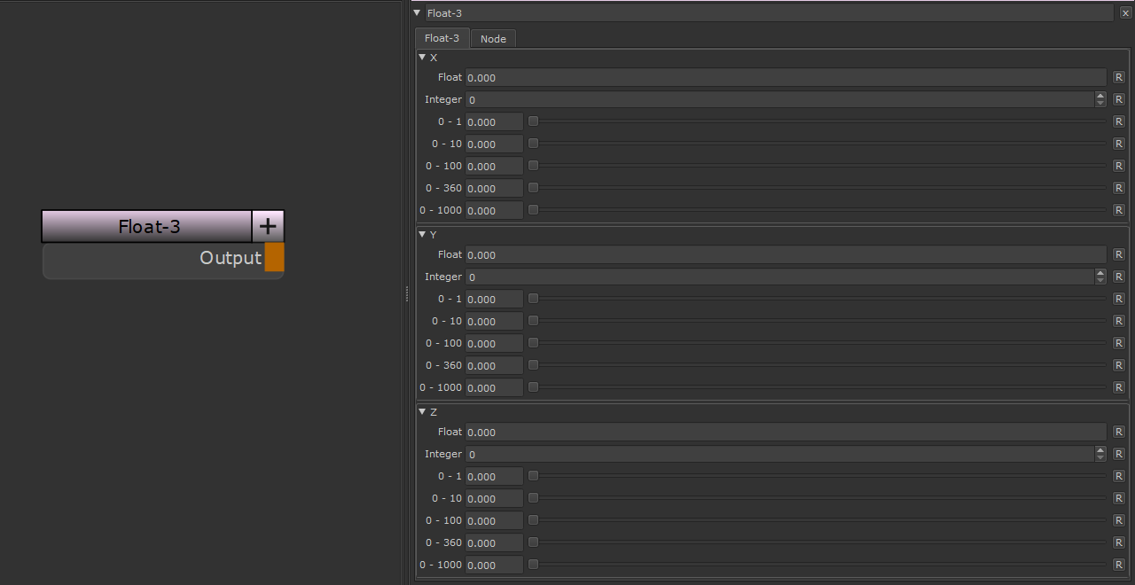 The Float-3 Node allows you to set separate values for the Red, Green and Blue Channels (X,Y,Z)