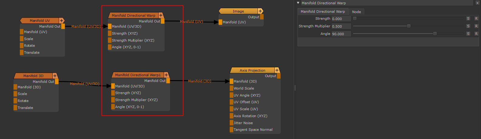 Manifold Directional Warp can be used to warp 2d or 3d space coordinates to achieve directional distortion effects in patterns, images and procedurals