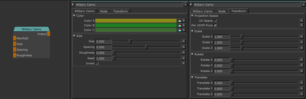 The 3 Colors that make up the Camouflage Pattern. ColorA is the 'background', B & C the pattern.