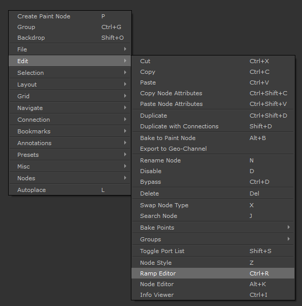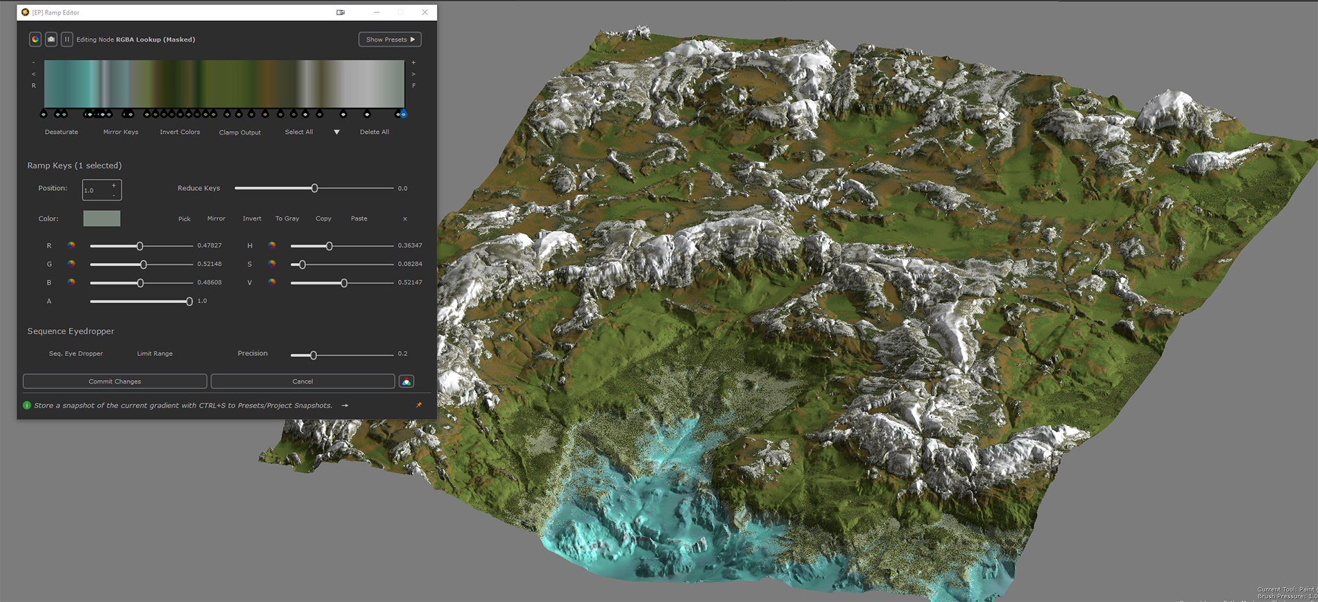 The Ramp Editor can be launched via the Right Mouse Click Nodegraph Context Menu: Example of using the Ramp Editor to colorize a terrain heightmap