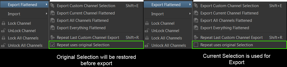 Repeat Last Custom Channel Export will rerun the last Export you performed using Export Custom Channel Selection.