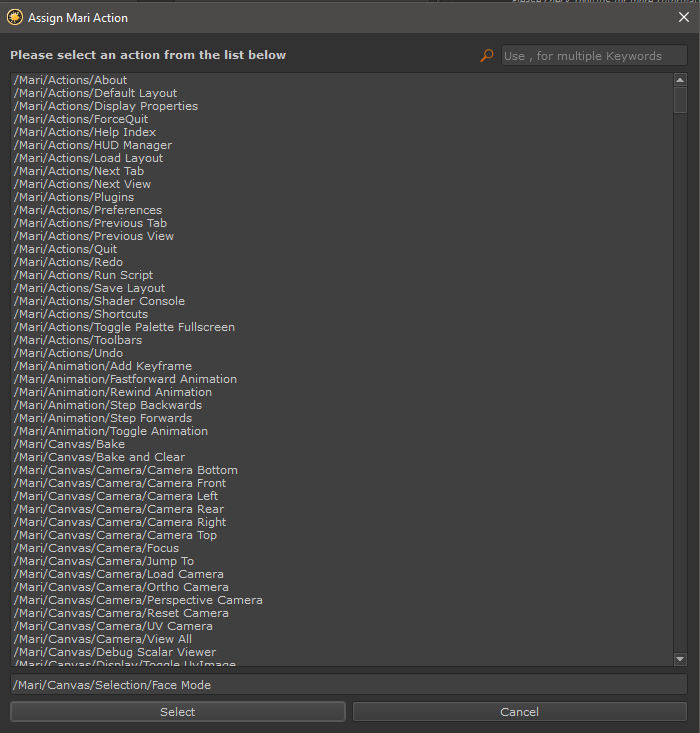 A Mari Action is any action that can be assigned a hotkey via the standard Mari Hotkey Editor.