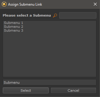 If your Button Type specifies the type 'Submenu clicking the Button Functionality Button launches a Browser to select which Submenu to link the Button to: