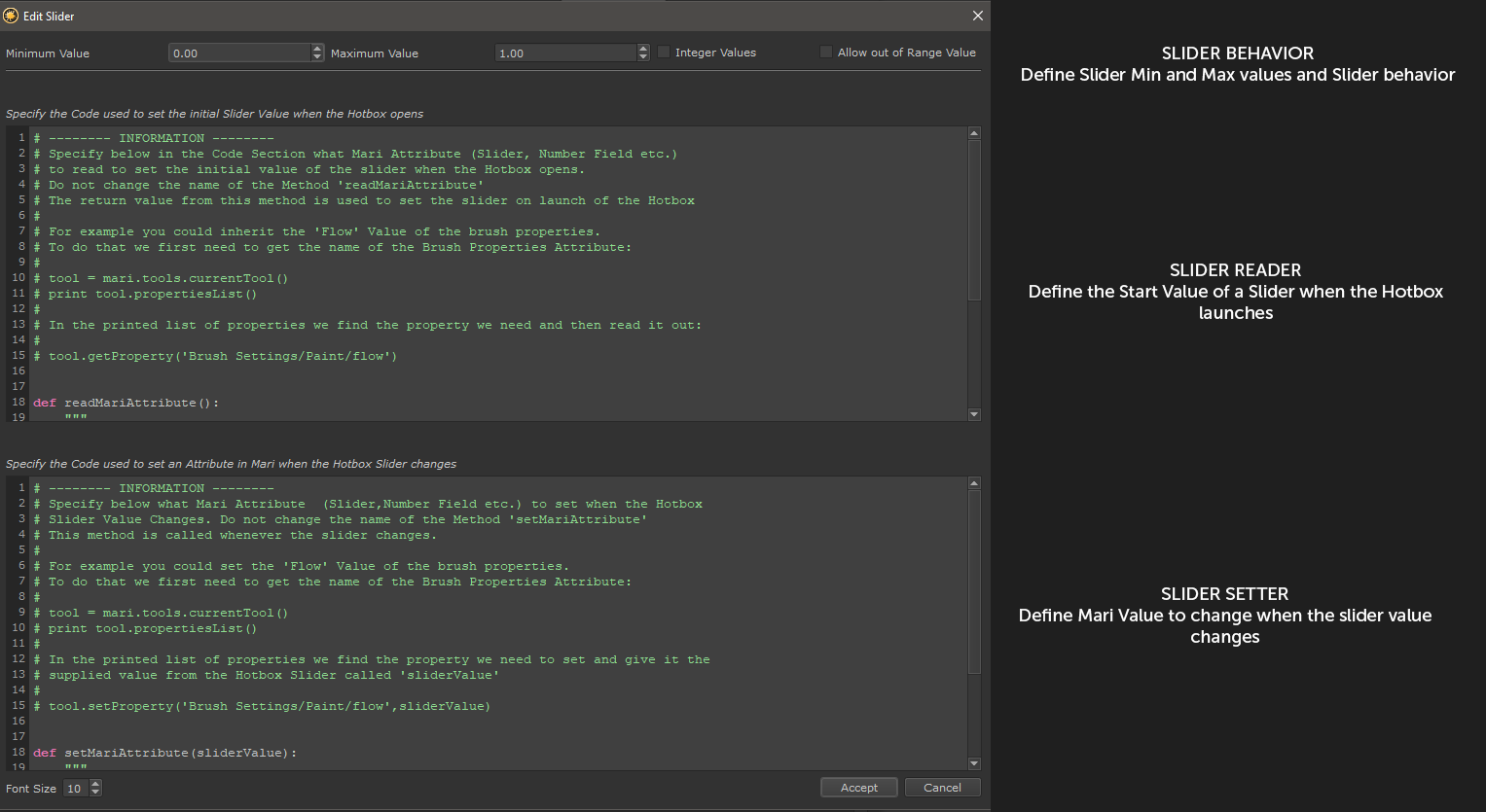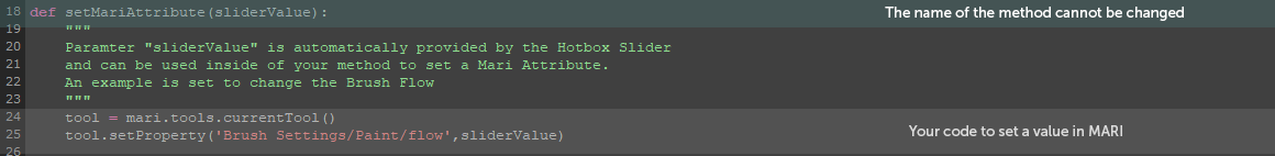 The Slider Setter Code Section reads the Hotbox Slider and sets a Mari attribute with the value from the hotbox slider whenever it changes.