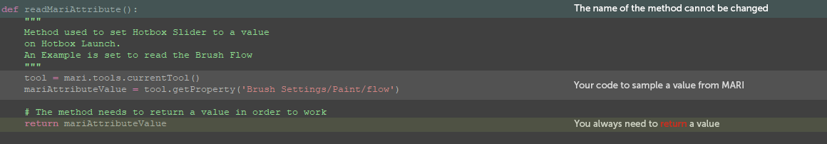 The Slider Reader Code Section reads a Mari Attribute and sets the Hotbox Slider to an appropriate value when the Hotbox is launched.