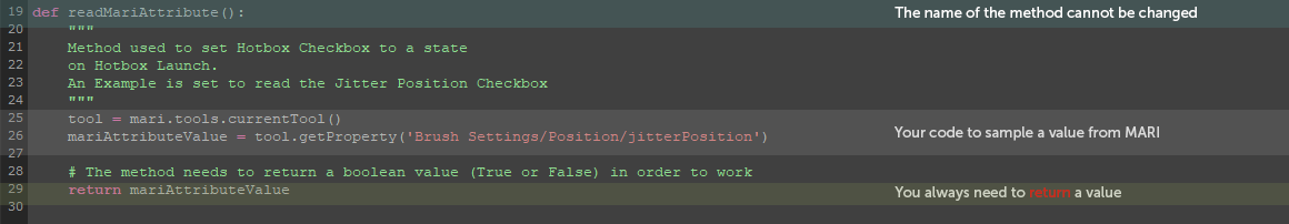 The Checkbox Reader Code Section reads a Mari Attribute and sets the Hotbox Checkbox to an appropriate value (checked/not checked) when the Hotbox is launched.