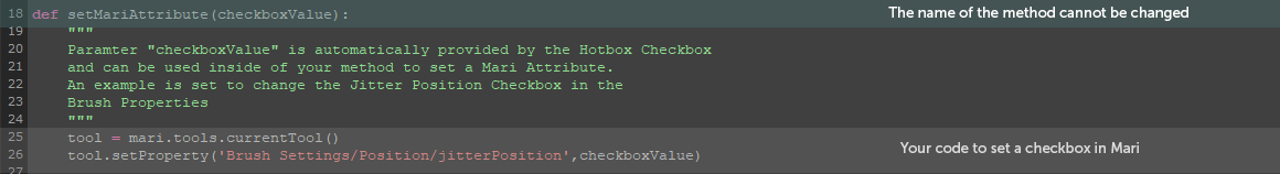 The Checkbox Setter Code Section reads the Hotbox Checkbox State (true/false) and sets a Mari attribute to the appropriate value.