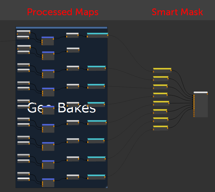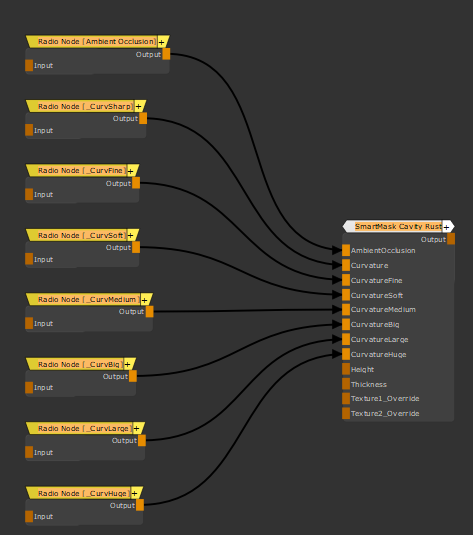 The Radio Nodes are used to connect to data necessary for geometry specific effects such as Ambient Occlusion and Curvature Maps