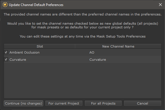 If your selected Channel for Ambient Occlusion or Curvature have Names that differ from the default Naming for Ambient Occlusion and Curvature Channels, a dialog will open, asking how you want to interpret the different-than-default Channel Names