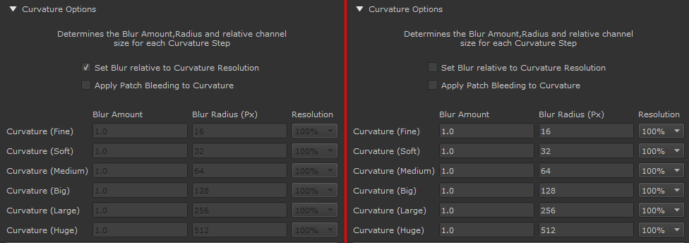 The Curvature Options with Set Blur relative to Curvature Resolution ticked on and off