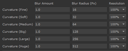 The Curvature Blur Options determine the Blur Amount and Blur Radius for each Curvature Variation Map, generated by the Tool.