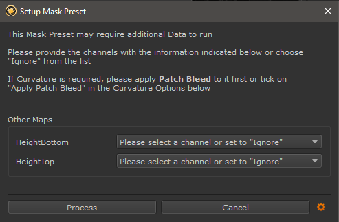 As a result if a Node such as the Height Blend Node would be created through the Preset Browser, the Smart Mask Setup Tool dialog would open allowing you to assign channels