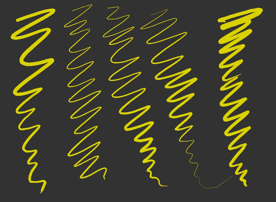 Example of similar strokes with different Pen Pressure Curves, here we are looking at the effect of
