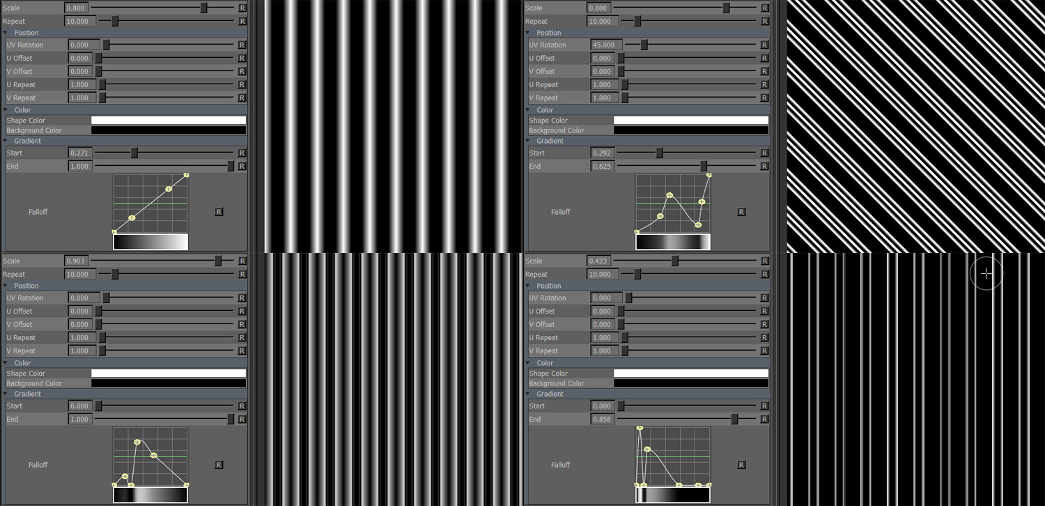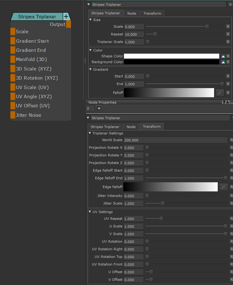 Stripes Triplanar creates Line Patterns. With the help of the included remapping you can create more complex patterns.
