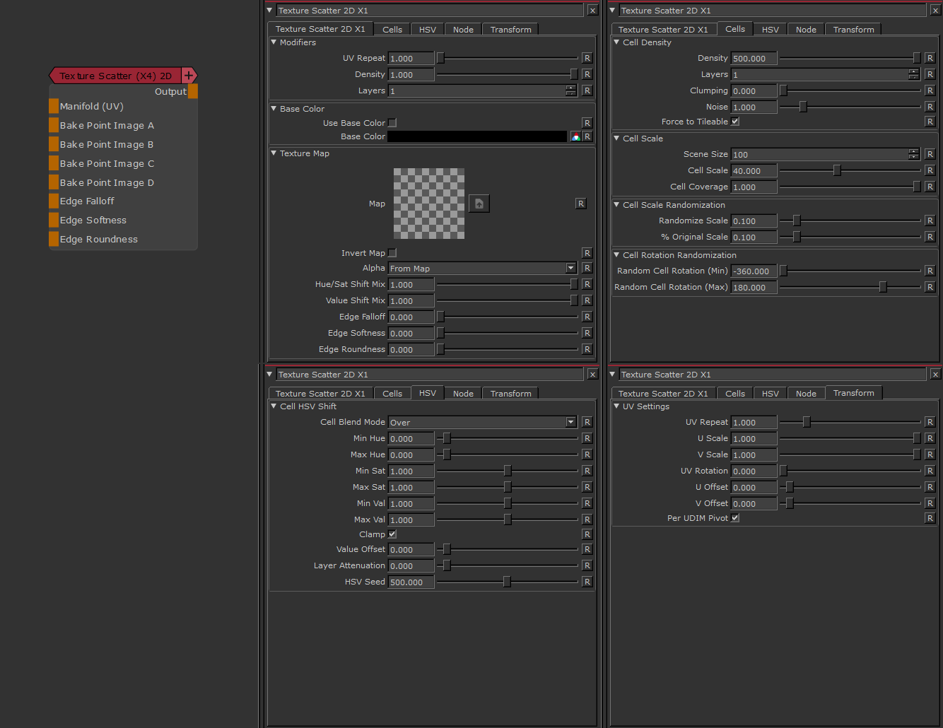 Texture Scatter 2D X4 is a complex texture bombing node, working in UV Space.