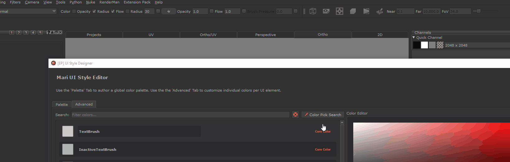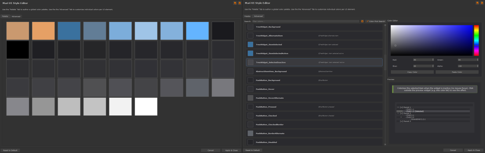 The "Style Designer" can be opened by choosing the "Custom" option in the Theme Dropdown Menu. It allows you to customize the internal Color Palette that Mari uses to draw its User Interface. You can customie the Palette globally, or drill down and