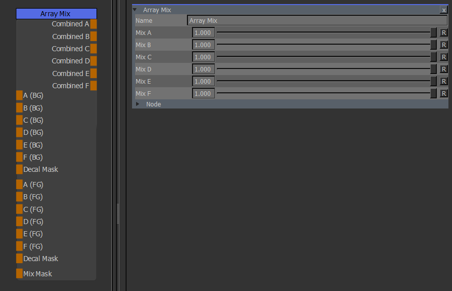 The Array Mix Node allows you to mix the Outputs from two different Array Nodes.