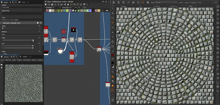 An Example of live streaming changes made to a material in Substance Designer (left) into Mari (right)
