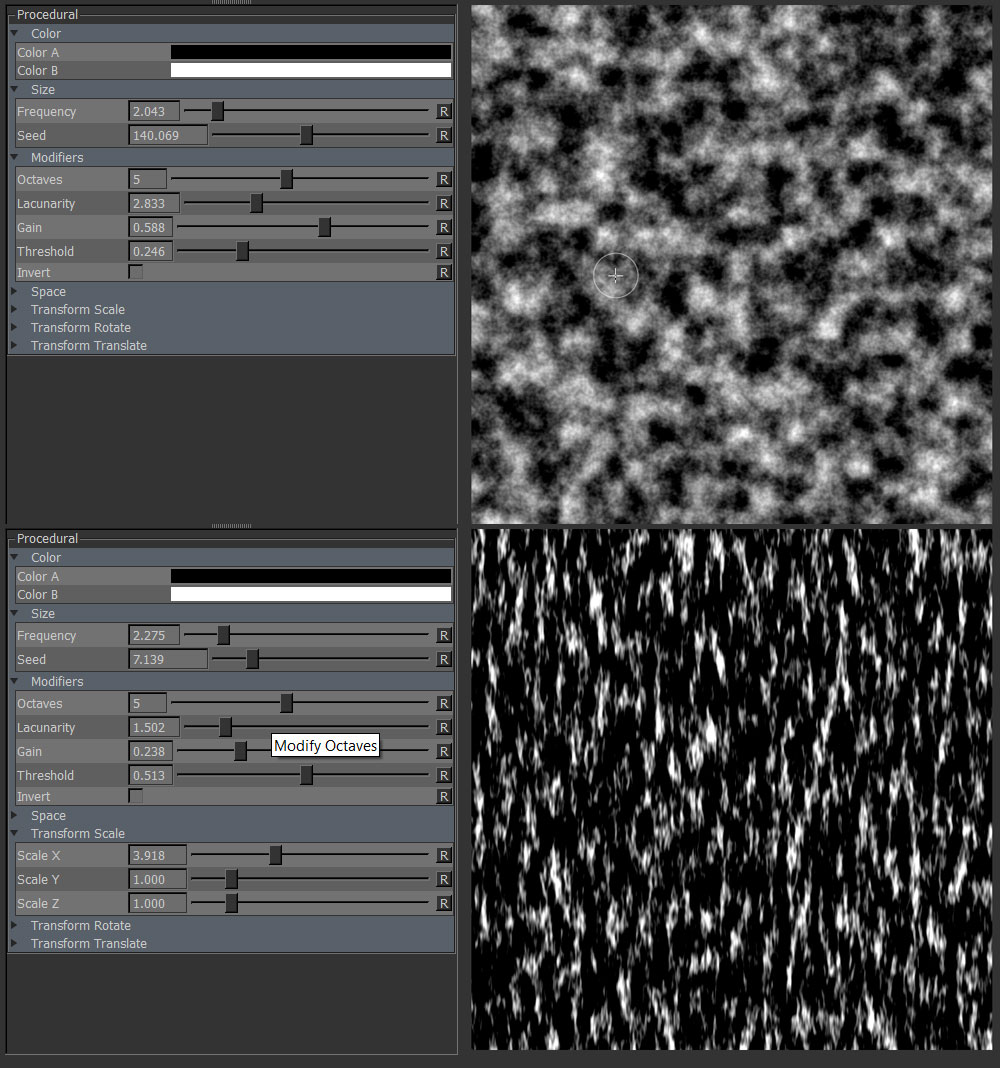 Will apply a scale along X,Y or Z to your noise. This is useful for creating patterns like woodgrain, drips etc.