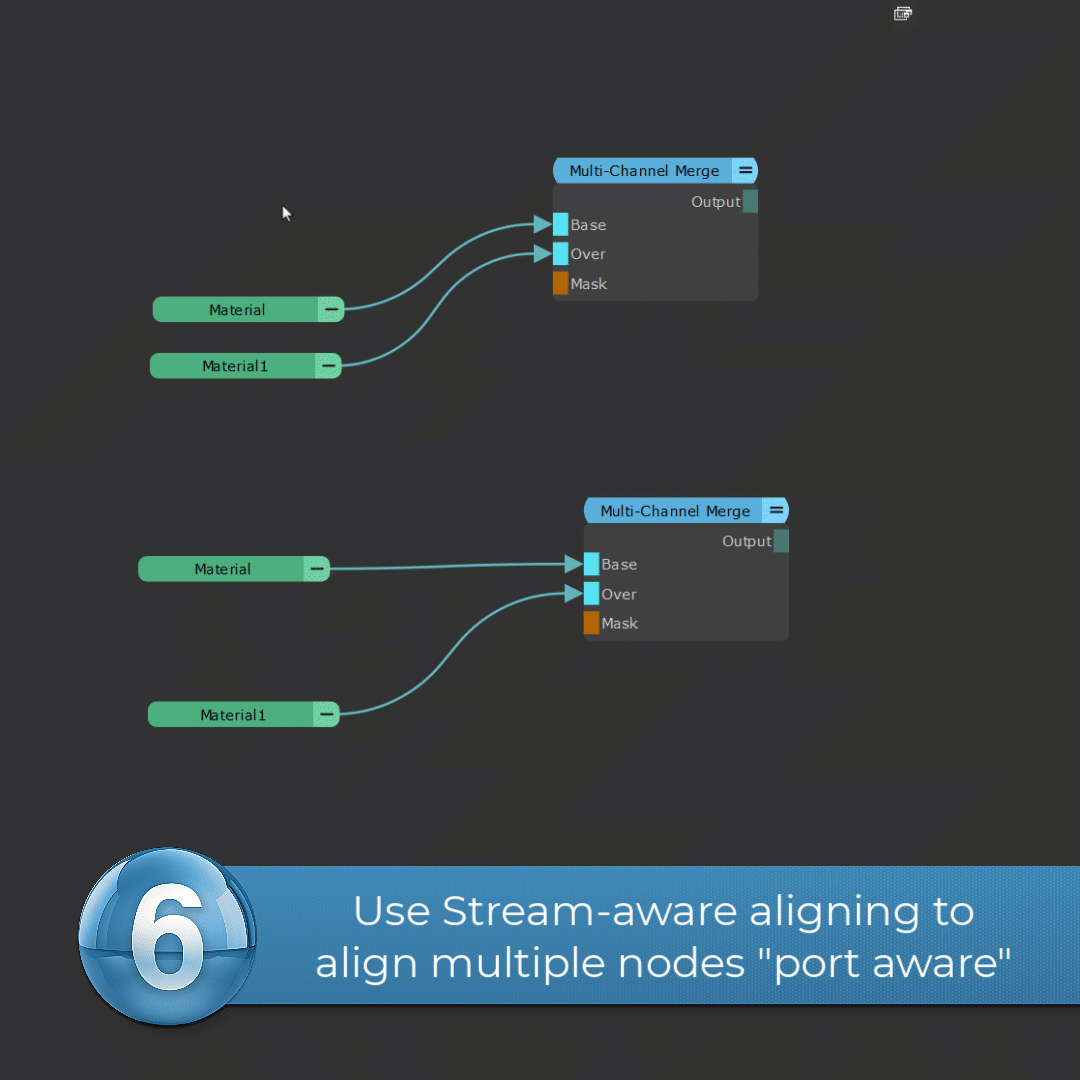 Nodes such as Blend Mode Nodes, Height Blends, Mixers etc. are now treated similarly to Mari's Merge Nodes during execution of "autolayout" (Hotkey "L") - resulting in cleaner automatic node distribution.
