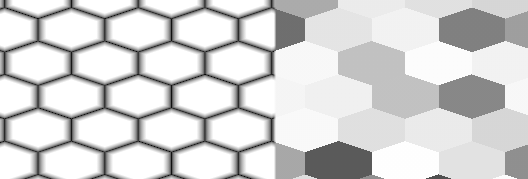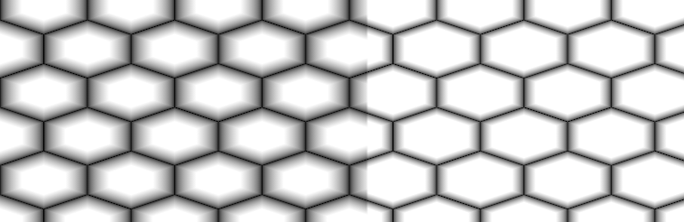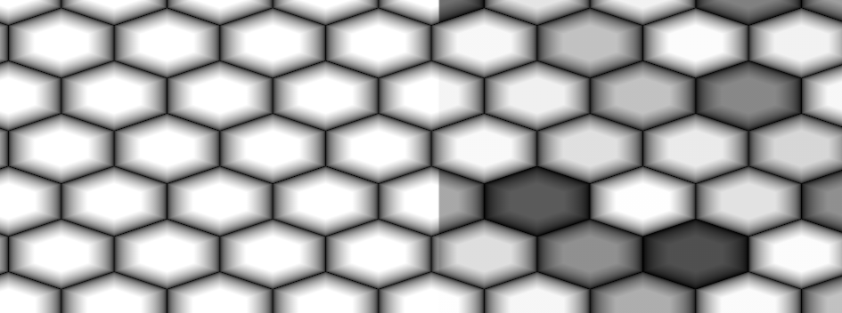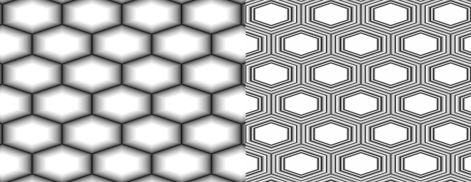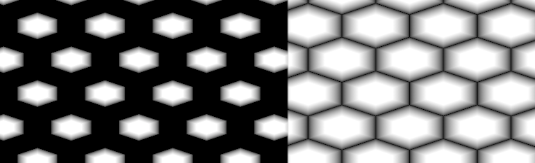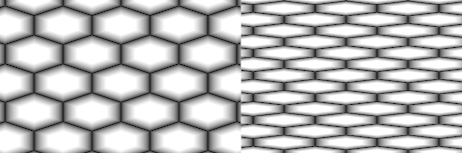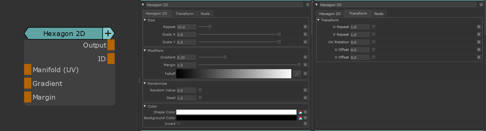 Hexagon 2D creates Hexagonal Patterns. Generation is done based on UV Space so there will be seams between tiles and uv shells.