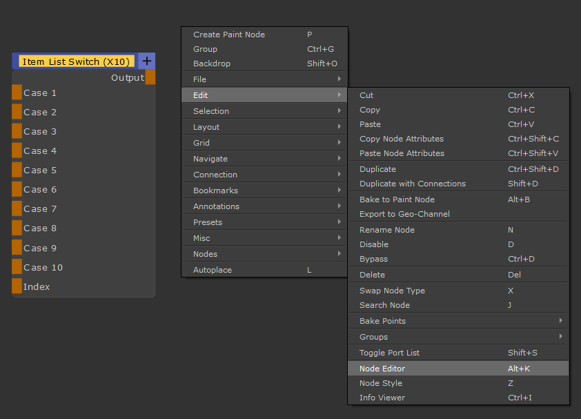3.With the "Item List Switch" Node selected, launch the Node Editor, by pressing the Hotkey ALT+K or going to the Right Mouse Click Context Menu of the Nodegraph, and choosing the Node Editor in the Edit-Submenu