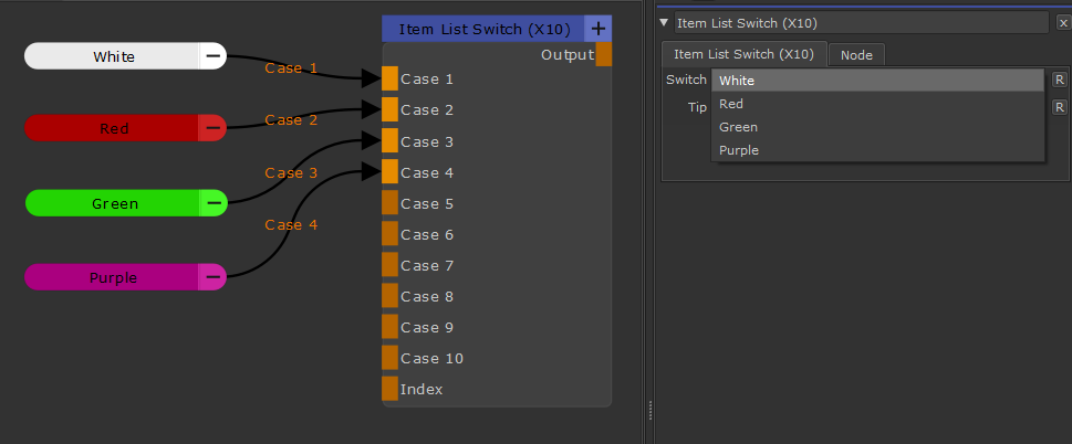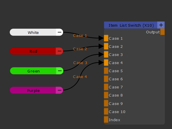 Our goal is to rename the individual items to have a more clear representation, what each input of the node does - in our example, switching between different colors. We will also remove a few entries since we don't need all 10.
