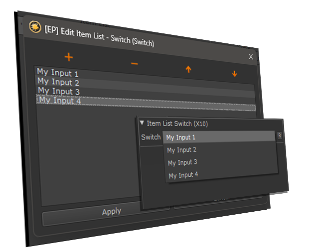 In the below example we will edit the Item List Switch (X10) Node directly, however the same principle applies to the Item List (X10) Node as well as cases where you are editing their exposed Attributes on a Group Node, Material etc.