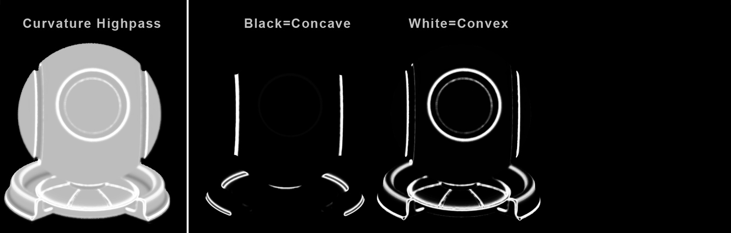 The Curvature Highpass Preset will create a Curvature Map separating Concave and Convex Edges.