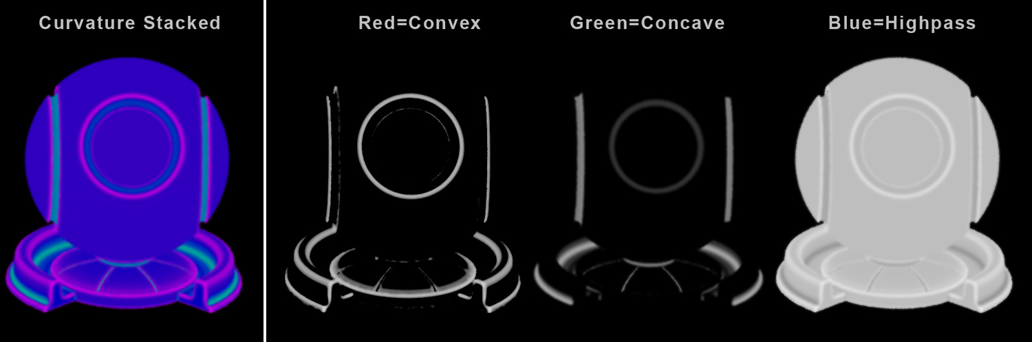 The Curvature Stacked Preset will create a RGB Curvature Map with each color channel including different information.