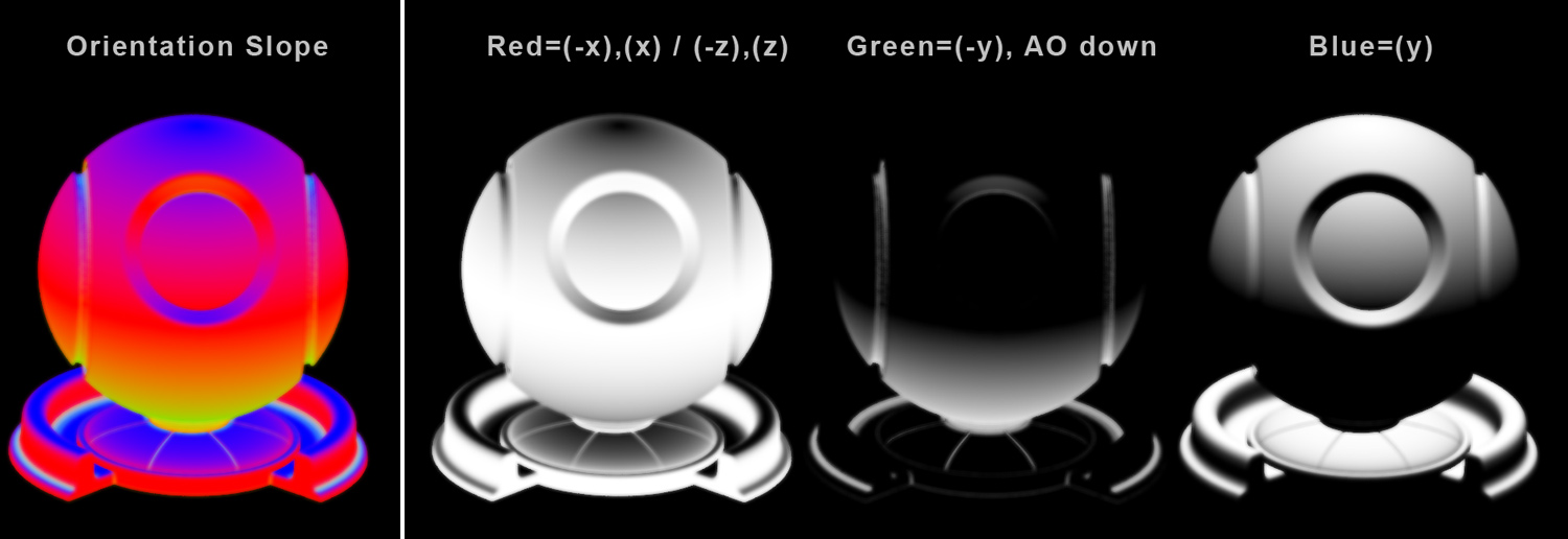 The Orientation Slope Preset will create a mixture of object space direction and occlusion maps, separating them into different Color Channels.