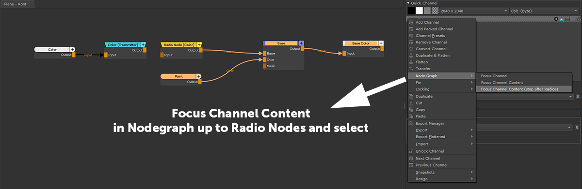 When executing with a Channel Selection, the Nodegraph Palette will be brought up and the Channel Node and / or the Channel Content Nodes will be