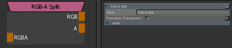 The RGB-A Split Node will split a single color input (RGBA) into one RGB and one Alpha Output.